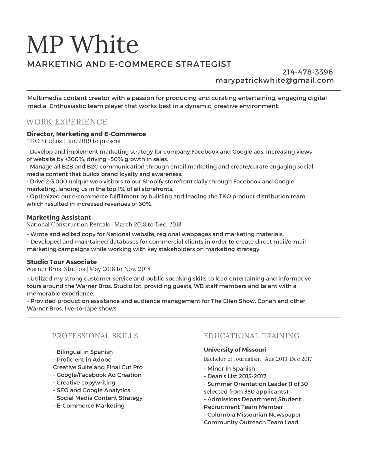 During the past two years of my post-grad life, I’ve had the opportunity to gain a multitude of experience during my early employment. From giving tours on the Warner Bros. Studio lot to creating and managing my own digital marketing campaigns at National Construction Rentals and, more recently, TKO Studios, I’ve had the chance to hone a variety of marketing and community-building skills in Los Angeles.
